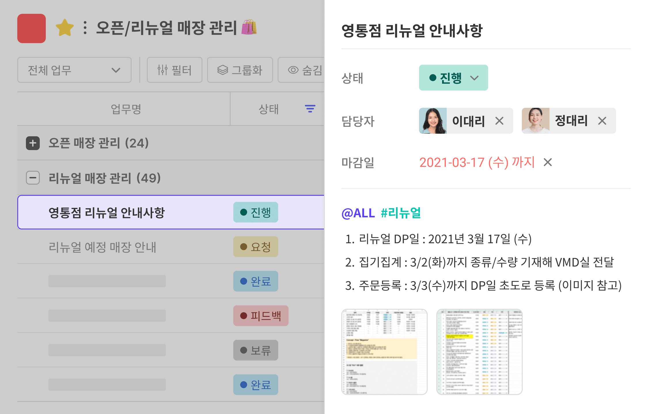 ๋งค์ฅ ์ด์์ ํ์ํ ์ผ์ , ์ฌ์ง, ์น์ธ ๊ณผ์ ์ด ๋ชจ๋ ํ ๊ณต๊ฐ์ ์ฐจ๊ณก์ฐจ๊ณก ๊ธฐ๋ก๋๊ธฐ ๋๋ฌธ์ ์๊ฐ์ด ์ง๋๋ ์ ๋ณด๊ฐ ํฉ์ด์ง๊ฑฐ๋ ๋๋ฝ๋์ง ์์ต๋๋ค.