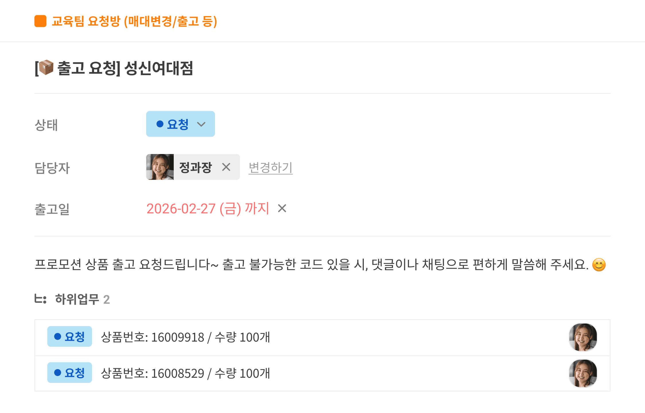 ์ค์ด ํ์ธํ๊ณ ์ด ํ๋ก์ ํธ์์ ๊ต์กํ์๊ฒ ์ถ๊ณ ๋ฅผ ์์ฒญํฉ๋๋ค. ๋งค๋ ๋ณ๊ฒฝ๊ณผ ์ถ๊ณ ์์ ์ ๋งค์ถ๊ณผ ์ง๊ฒฐ๋๋ฏ๋ก ๊ฐ ๋ถ์ ๊ฐ ์ ํํ ์ ๋ณด ๊ณต์ ๊ฐ ํ์์ ์ด๋ฉฐ, ํ๋ก์ฐ์์ ์