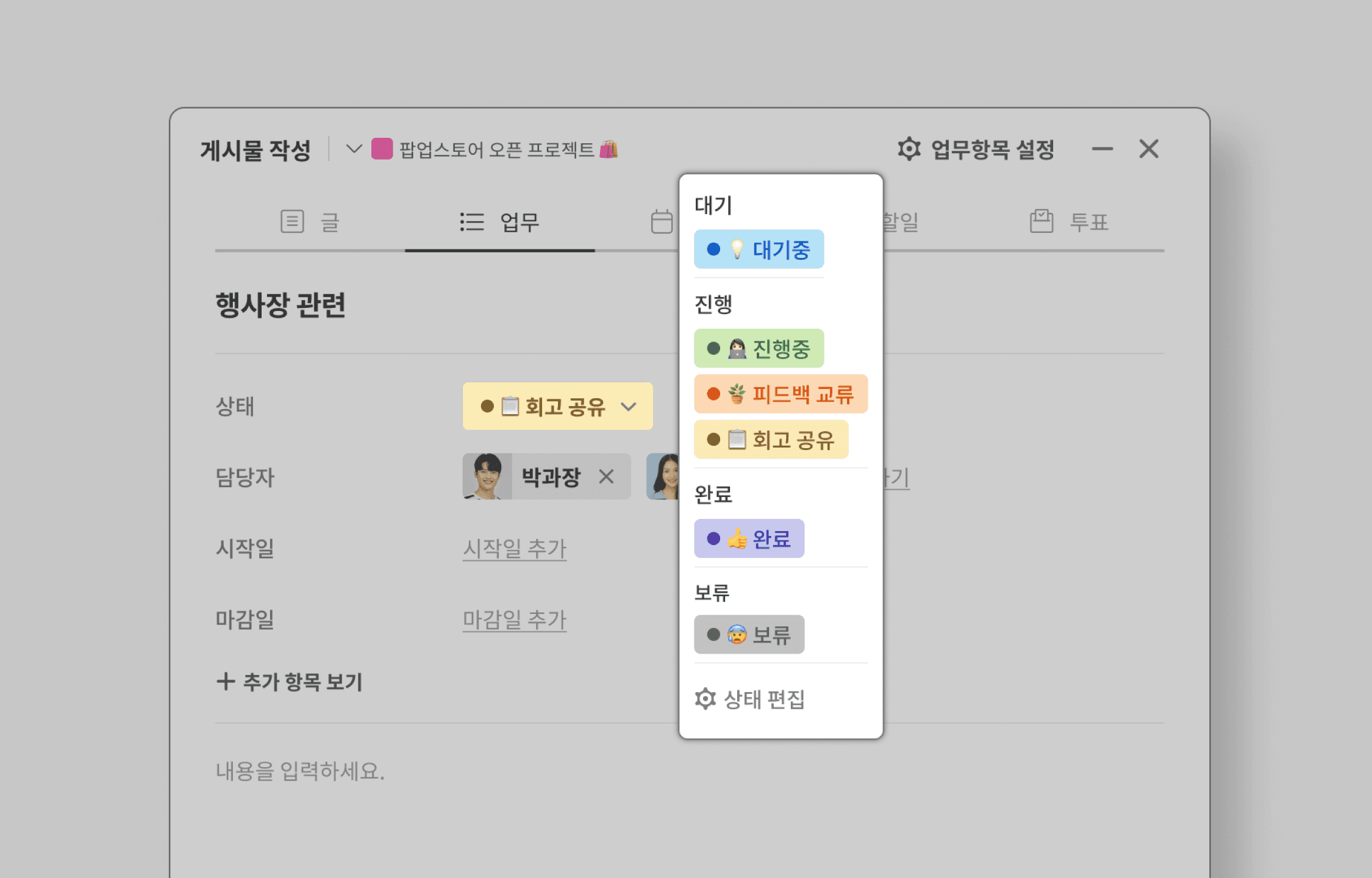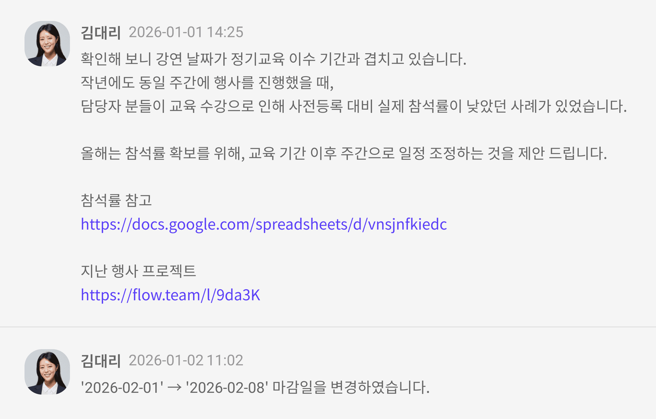 ํ๋ก์ฐ๋ ์ ๋ฌด, ๋ํ, ํ์ผ, ์ผ์ ์ด ๊ฐ๊ฐ ํฉ์ด์ง์ง ์๊ณ ํ ๊ณต๊ฐ ์์์ ์ฐ๊ฒฐ๋๋๋ก ์ค๊ณ๋์ด ์์ต๋๋ค. ๊ทธ๋์ ํ๋ก์ ํธ๊ฐ ๋๋๋ ๊ณผ์ ์ด ์ฌ๋ผ์ง์ง ์์ต๋๋ค. ๋๊ฐ ์ธ์ ์ด๋ค ํ๋จ์ ๋ด๋ ธ๋์ง, ์ด๋ค ์๋ฃ๊ฐ ๊ทผ๊ฑฐ๊ฐ ๋์๋์ง๊ฐ ๊ทธ๋๋ก ๋จ์ต๋๋ค. ์ผ์ ํ๋ฆ์ด ์๊ฐ์์ผ๋ก ์์ด๊ณ , ๋ค์ ํ๋ก์ ํธ์ ์ถ๋ฐ์ ์ด ๋๋ ๊ฒ์ด์ฃ .