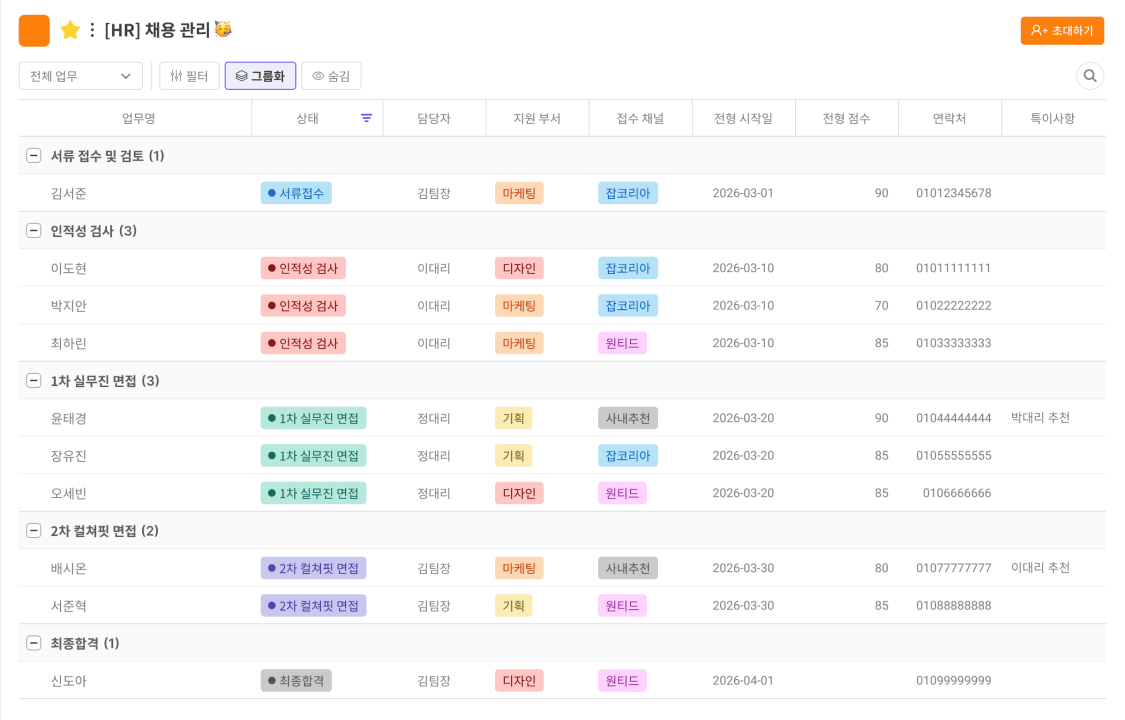 ๋ฌด ํน์ฑ์ ๋ง๊ฒ โ์บ ํ์ธ ์ ํโ, โ์ฑ๋โ, โ๊ณ ๊ฐ ๋ฑ๊ธโ, โ์์ฐโ, โ์งํ ๋ฐฉ์โ ๊ฐ์ ํญ๋ชฉ์ ์์ ๋กญ๊ฒ ๊ตฌ์ฑํด ๋ ์ ์์ต๋๋ค.