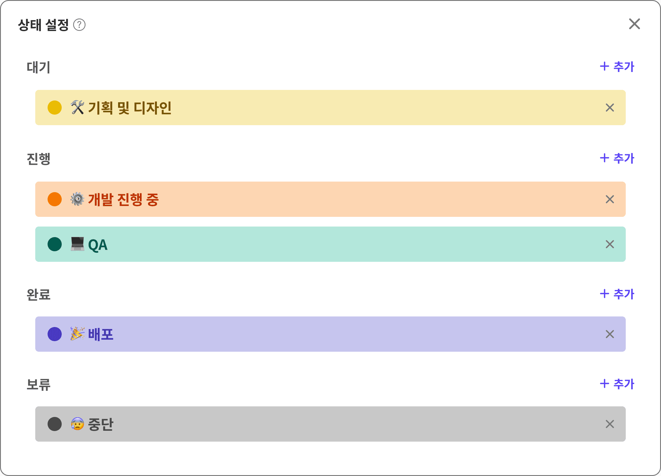 ์๋ฅผ ๋ค์ด ๊ฐ๋ฐํ์ด๋ผ๋ฉด [๊ธฐํ โ ๋์์ธ โ ๊ฐ๋ฐ โ QA โ ๋ฐฐํฌ โ ๋ชจ๋ํฐ๋ง], ์ ์กฐยท์ ํต ์กฐ์ง์ด๋ผ๋ฉด [์ค๊ณ โ ์ ์ โ ๊ฒ์ โ ์ถ๊ณ โ ์ค์น โ A/S ๊ด๋ฆฌ]์ฒ๋ผ ์ค์ ๋ก ์ฌ์ฉํ๋ ๋จ๊ณ๋ฅผ ๊ทธ๋๋ก ์ฎ๊ฒจ ์ฌ์ฉํ ์ ์์ต๋๋ค.