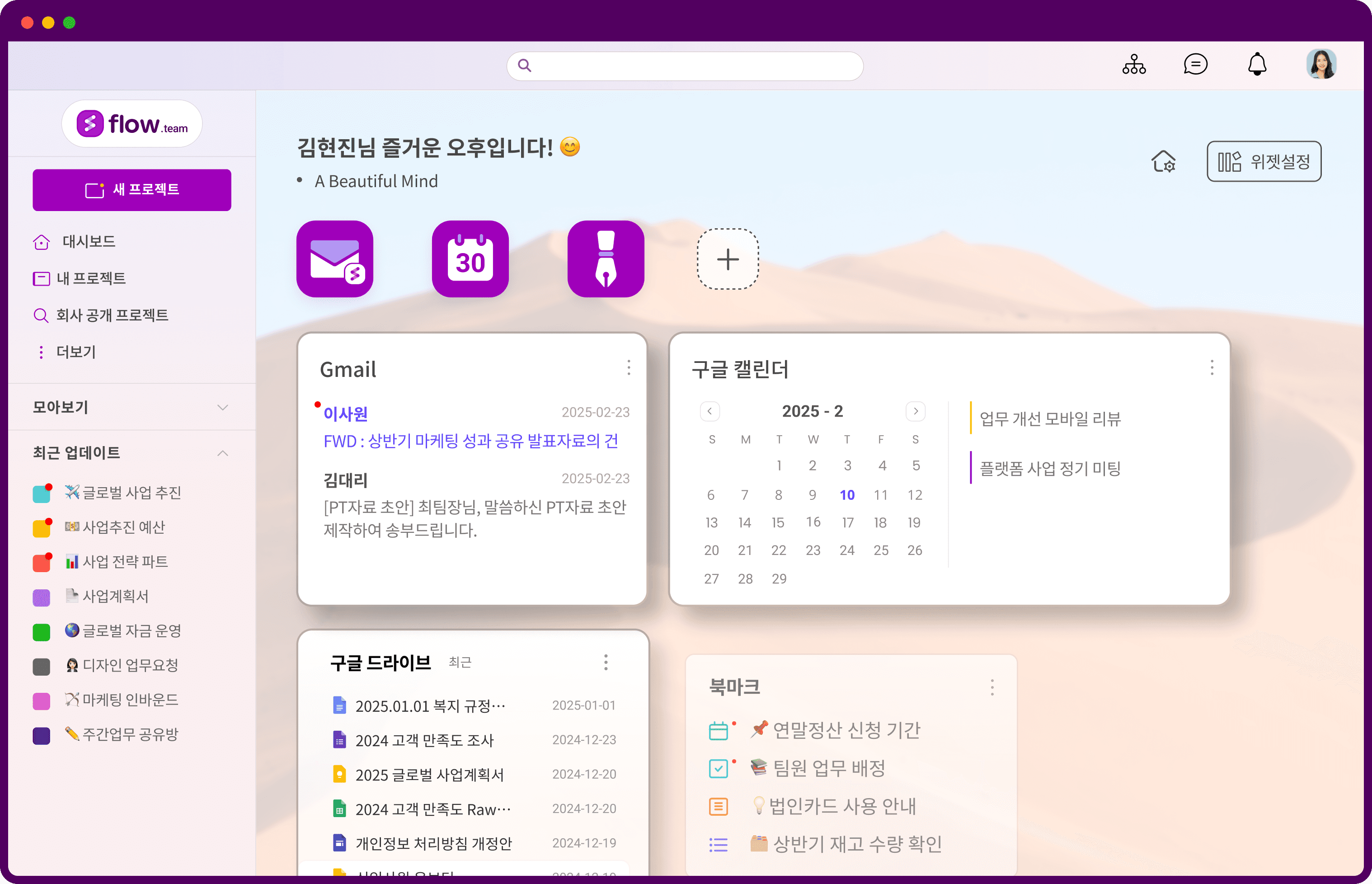 ํ๋ก์ฐ ํ(๋์๋ณด๋)์์ Gmail, ๊ตฌ๊ธ ๋๋ผ์ด๋ธ, ๊ตฌ๊ธ ์บ๋ฆฐ๋์ ์ฃผ์ ์ ๋ณด๋ฅผ ๋ฐ๋ก ํ์ธํ ์ ์๋ Google Workspace์ฉ ์์ ฏ์ด ์ถ๊ฐ๋์์ต๋๋ค. ์ต๊ทผ ์์ ํ ๋ฉ์ผ ๋ฆฌ์คํธ, ์ค๋ ์์ ๋ ์บ๋ฆฐ๋ ์ผ์ , ์ต๊ทผ ์ด์ด๋ณธ ๋๋ผ์ด๋ธ ํ์ผ๊น์ง ํ๋ก์ฐ ์์์ ๋ฐ๋ก ํ์ธํ ์ ์์ต๋๋ค.