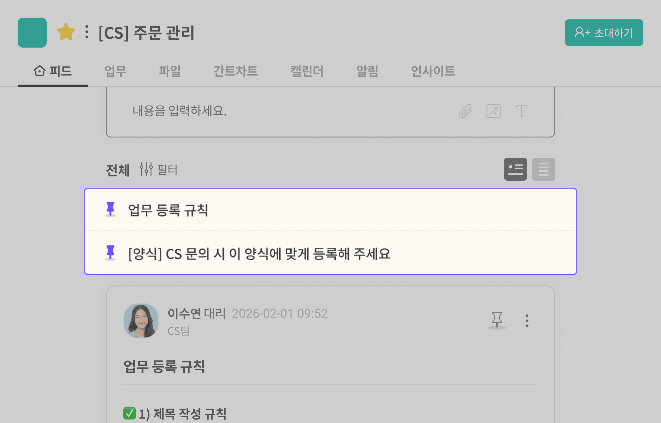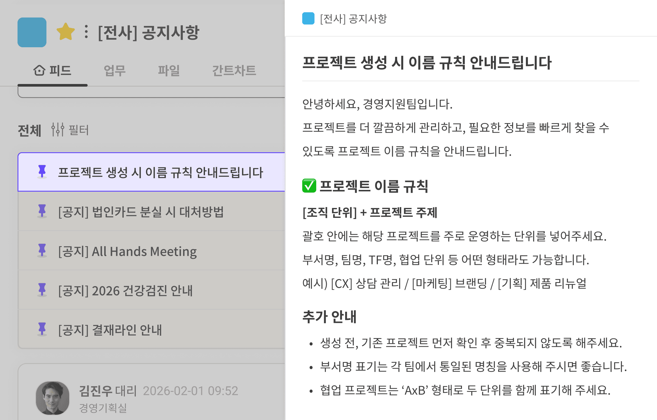 ํ๋ก์ ํธ ์์ฑ ๊ท์น์ ์ ํ๋ค๋ฉด, ์ ์ฌ๊ฐ ํ์ธํ ์ ์๋๋ก ๊ณต์งํด์ผ ํฉ๋๋ค. ๊ณต์ง์ฌํญ ํ๋ก์ ํธ์ ํ๋ก์ ํธ ์์ฑ ๊ท์น์ ์ ๋ฆฌํด ๋๋ฉด, ๊ตฌ์ฑ์๋ค์ด ์ธ์ ๋ ์ฐธ๊ณ ํ๋ฉฐ ๊ฐ์ ๊ธฐ์ค์ ์ ์งํ ์ ์์ต๋๋ค.